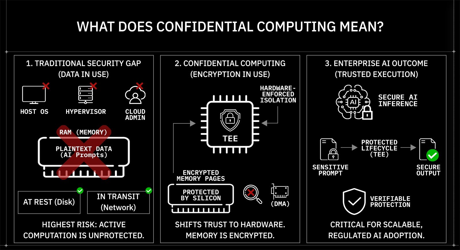 Neither protects memory during execution. AI workloads amplify this gap because prompts, intermediate tensors, embeddings, and generated outputs may contain regulated or proprietary information.