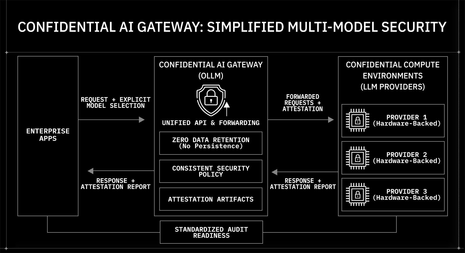 OLLM’s confidential AI gateway provides a single API endpoint through which applications send requests to specified confidential LLM providers. The calling application selects the model. OLLM handles secure forwarding, attestation verification, and zero-retention enforcement across requests. It provides configurable zero-retention controls, hardware-backed isolation, and attestation-backed execution evidence across models. This centralized architecture reduces fragmentation while maintaining verifiable privacy and alignment with compliance requirements.