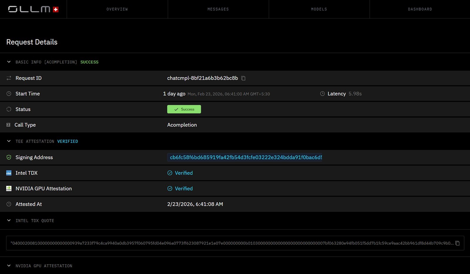 OLLM integrates Intel TDX to isolate CPU-level execution inside encrypted trust domains and uses NVIDIA GPU attestation to verify GPU-bound LLM inference workloads. This combination secures both CPU and GPU execution paths. Cryptographic TEE attestation proofs allow enterprises to validate that inference runs inside hardware-isolated, verified environments.