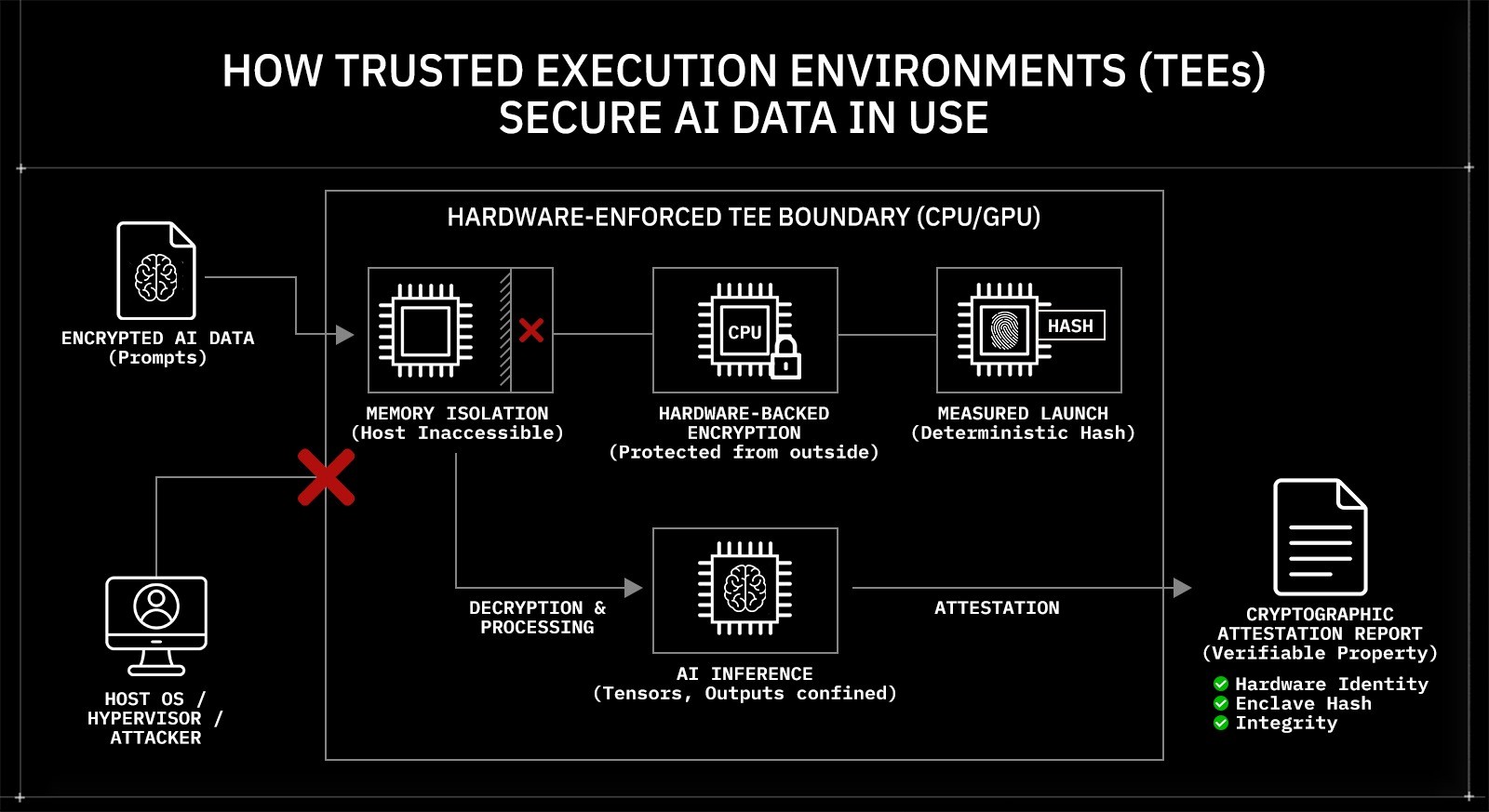 This directly addresses the runtime exposure problem. When an AI prompt is processed inside a TEE, decryption occurs only within the enclave. Intermediate tensors, embeddings, and generated outputs remain confined to protected memory during execution.