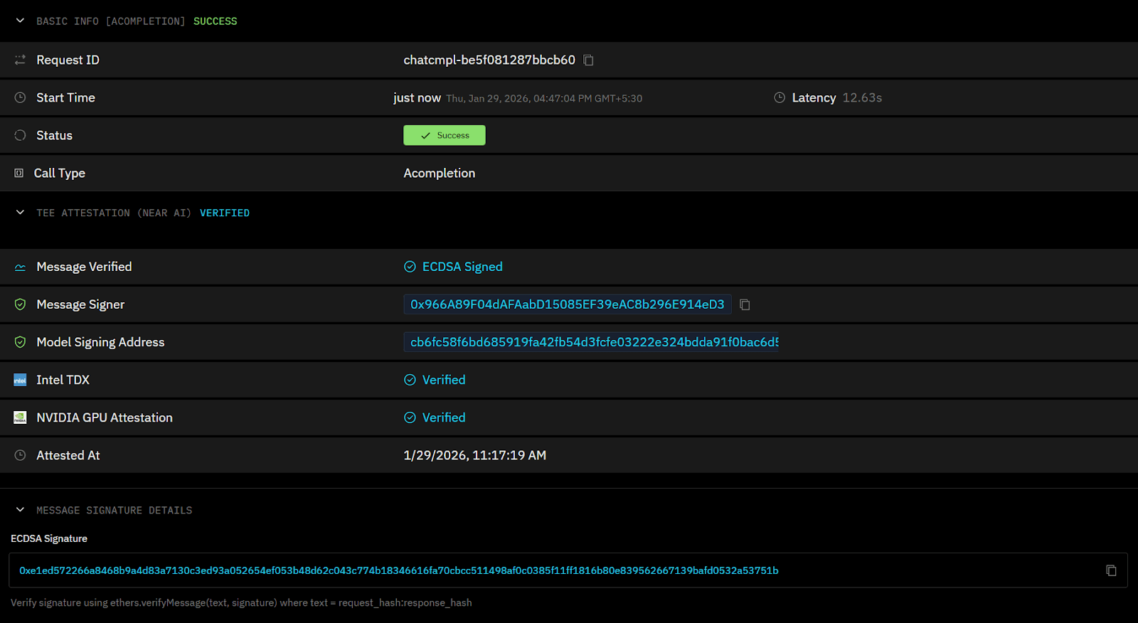 OLLM addresses this risk by making execution verifiable rather than assumed. Model workloads run in Trusted Execution Environments (TEEs), with attestation support via Intel TDX and NVIDIA GPU attestation. This attestation allows users to cryptographically verify, per request, that execution occurred inside an encrypted TEE rather than trusting contractual claims. Combined with enforced zero data retention, this shifts security from documentation to measurable guarantees.