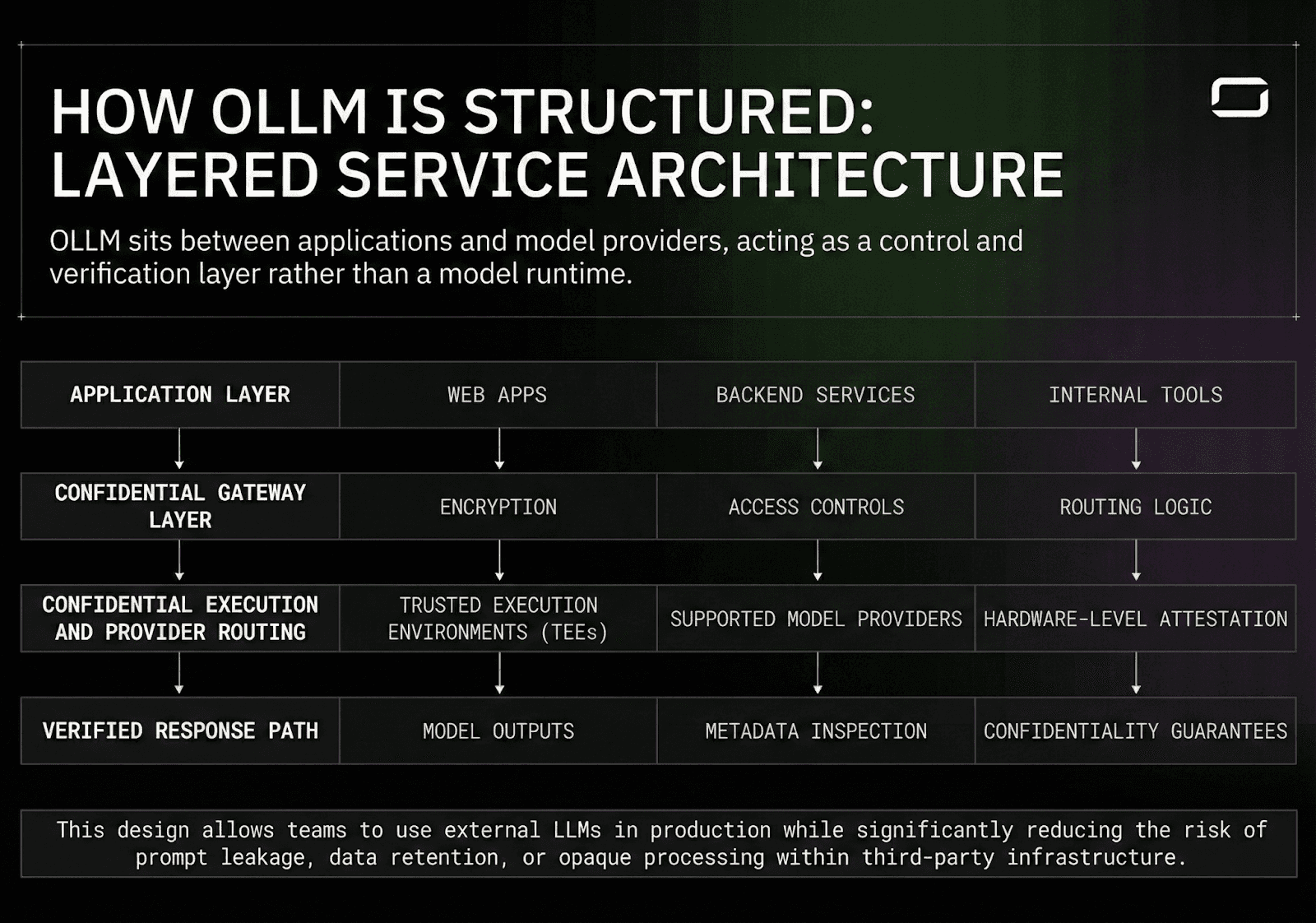 In these scenarios, the goal is not to move inference in-house, which can be costly, operationally complex, and difficult to maintain at scale. Operating on-site data centers or dedicated GPU infrastructure introduces ongoing challenges around capacity planning, reliability, and security. Instead, teams route requests through OLLM to reduce the amount of sensitive data exposed to external model providers. By enforcing confidential execution and hardware-backed verification before inference, OLLM enables teams to use modern LLMs while maintaining stronger guarantees around data handling and auditability.